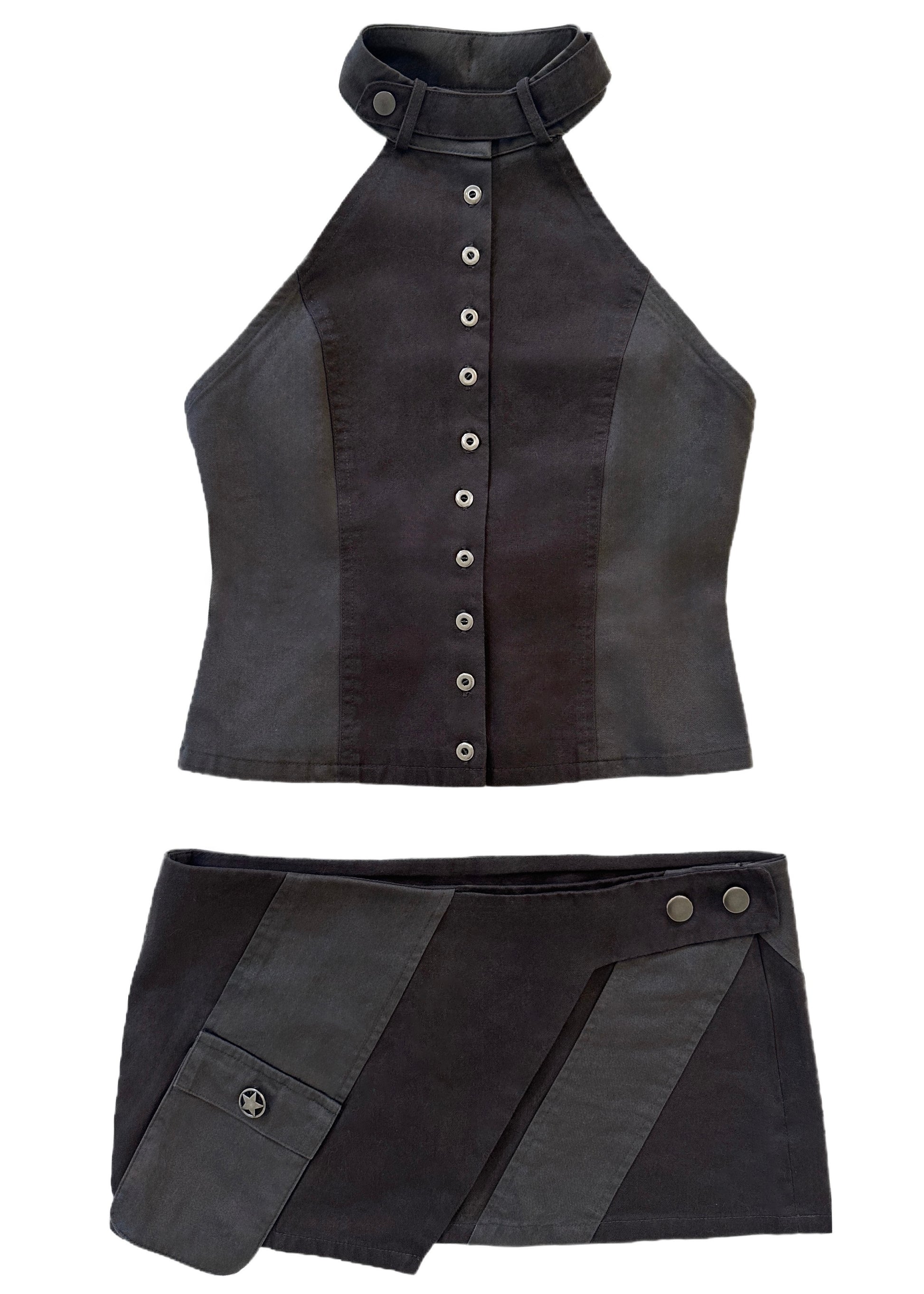 A low-rise mini with sharp construction and contrast panels. Cut in two tones of charcoal cotton twill, this skirt features angled paneling, a layered hem, and a structured silhouette. Snap closures at the waist and an asymmetrical flap pocket with star-stamped hardware adds a bold finish.
